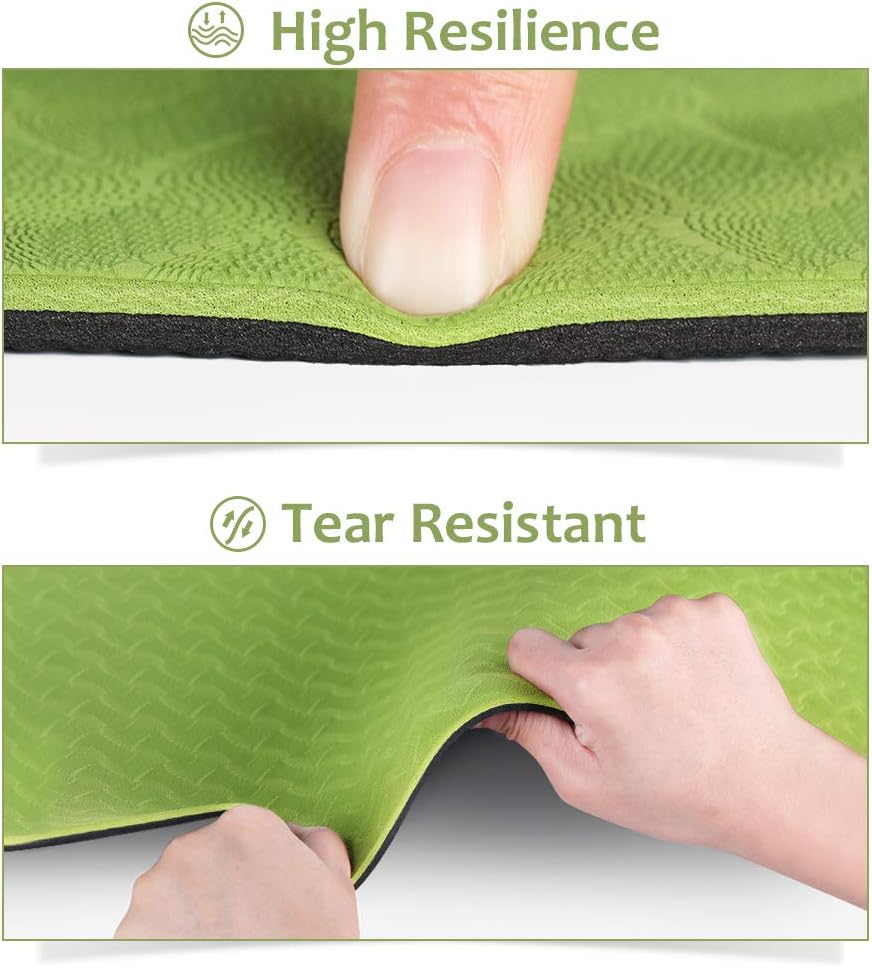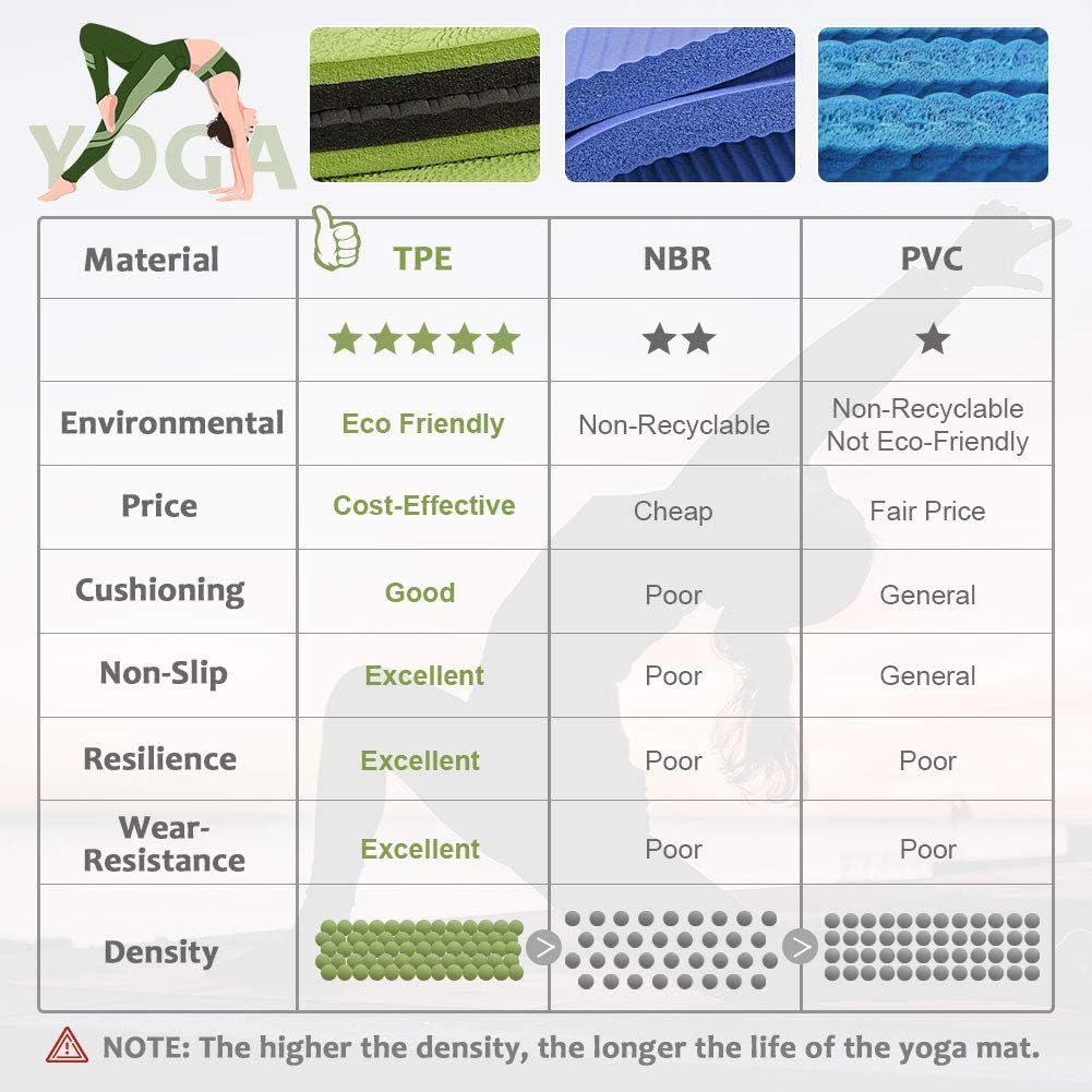 【Natural TPE Yoga Mat】Our yoga mats are composed of TPE materials. TPE is made of natural rubber which is not only non-toxic and odorless but also 100% recyclable. Whether it is anti-slip, comfort, and durability, it is better than NBR foam mat. TPE yoga mat is suitable for beginners or advanced yoga practitioners