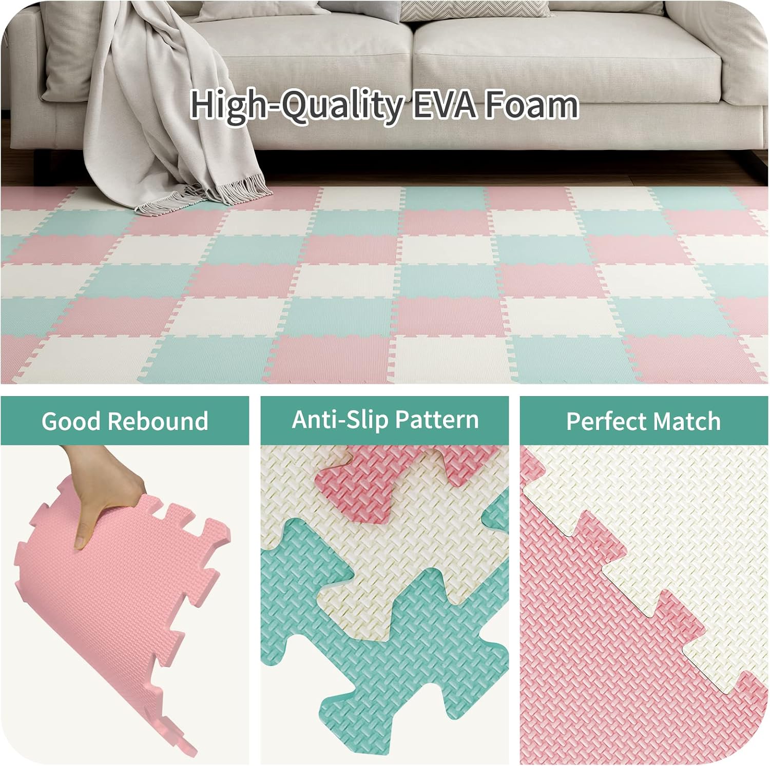 【Safe】-Made from high-density EVA foam to keep a soft surface for exercising and playing.Our cushions are all with edge pieces, the whole pack with all the edge pieces covers about 1.73 square meters/18.62square feet.