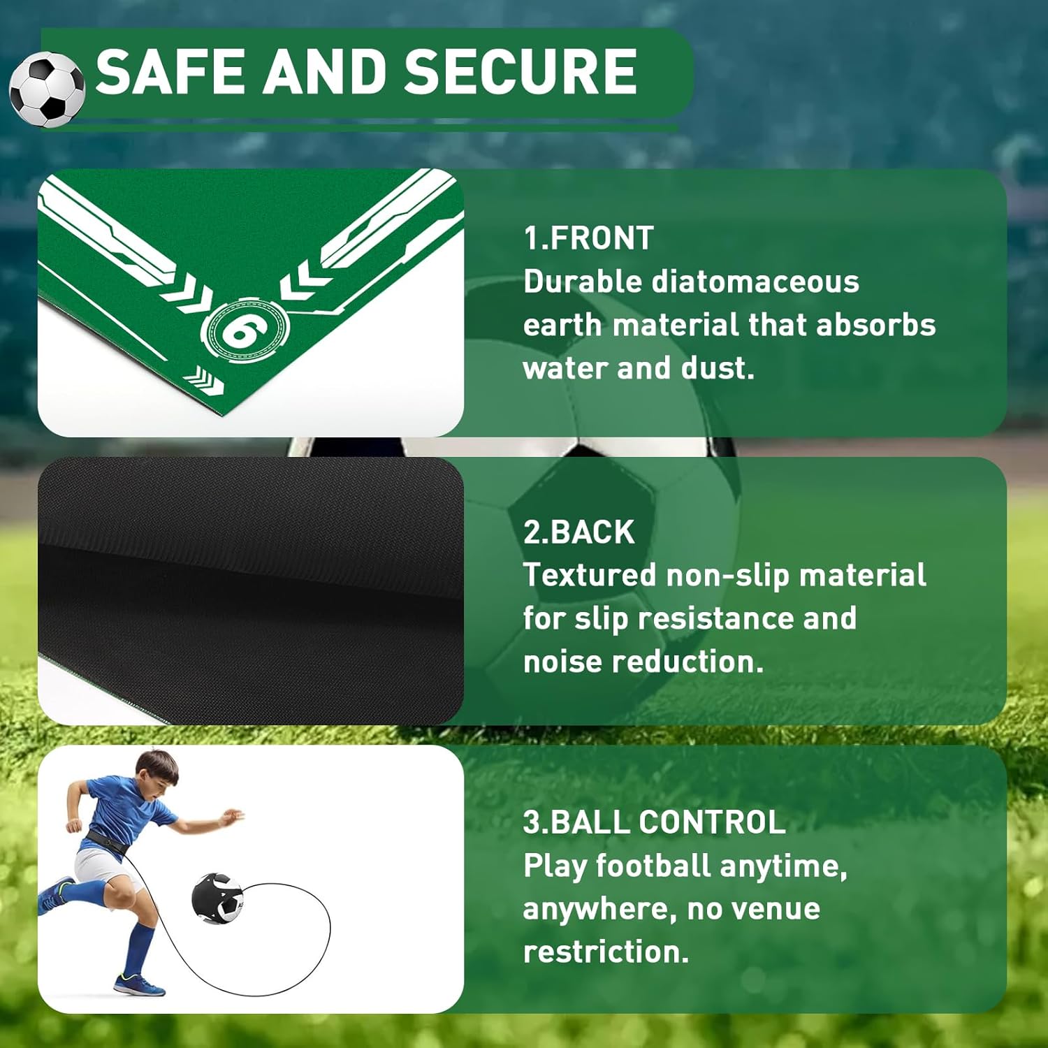 No-slip And Silent Shock-absorbing: The backing of the soccer training mat is made of non-slip fabric, which ensures the safety of training and maximizes the effect of football footwork training. The front of it is made of technology velvet, feeling comfortable to touch it. The fabric has excellent silent shock-absorption properties which makes training more comfortable
