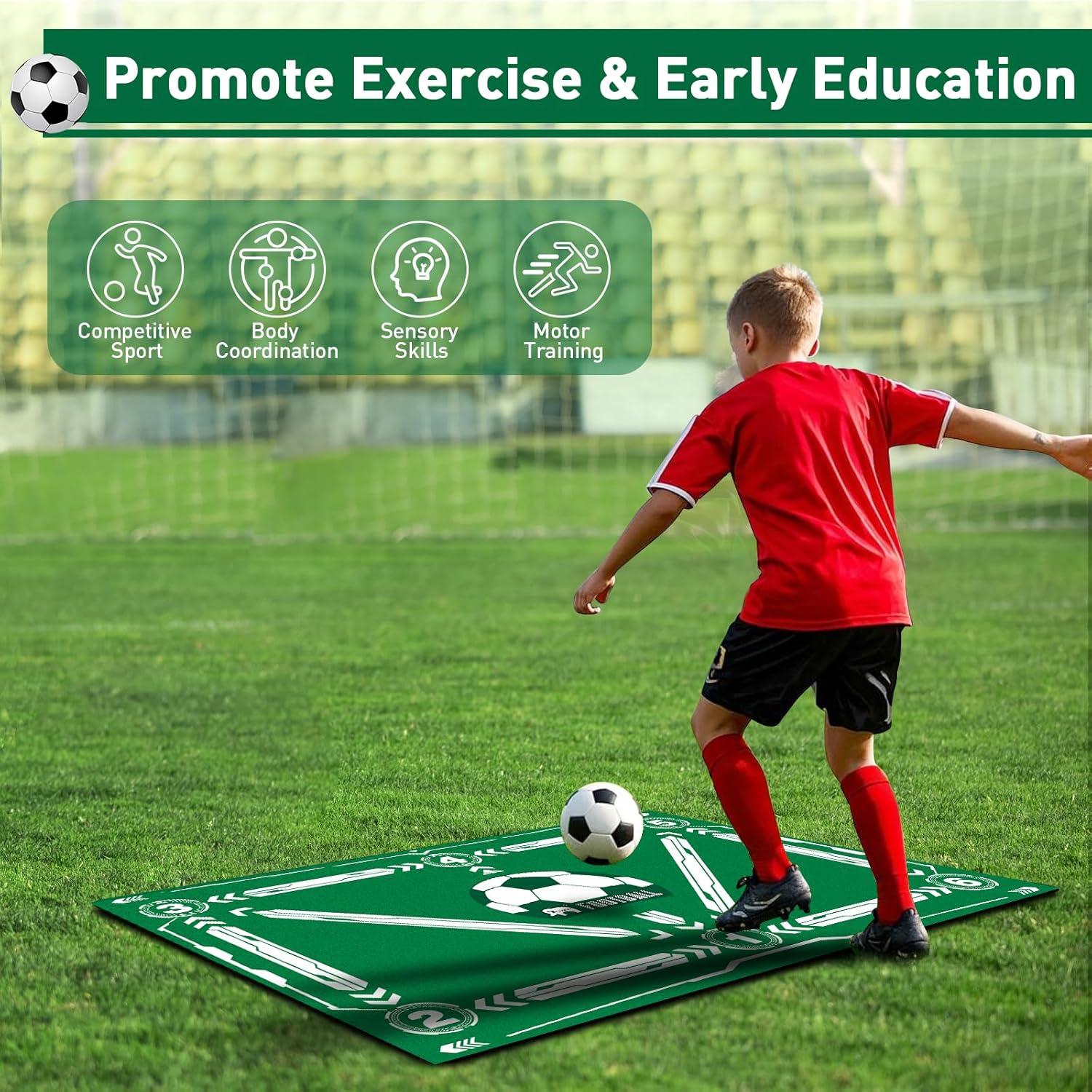 L-Shape Dribbling Training: L-shaped push-pull training is a key exercise for mastering rapid changes of direction on the field and this soccer area rug is designed for L-shaped push-and-pull training. Using this soccer mat is helpful for more effective speed and agility training. With our training mat, you can practice your football control skills with both your left and right foot