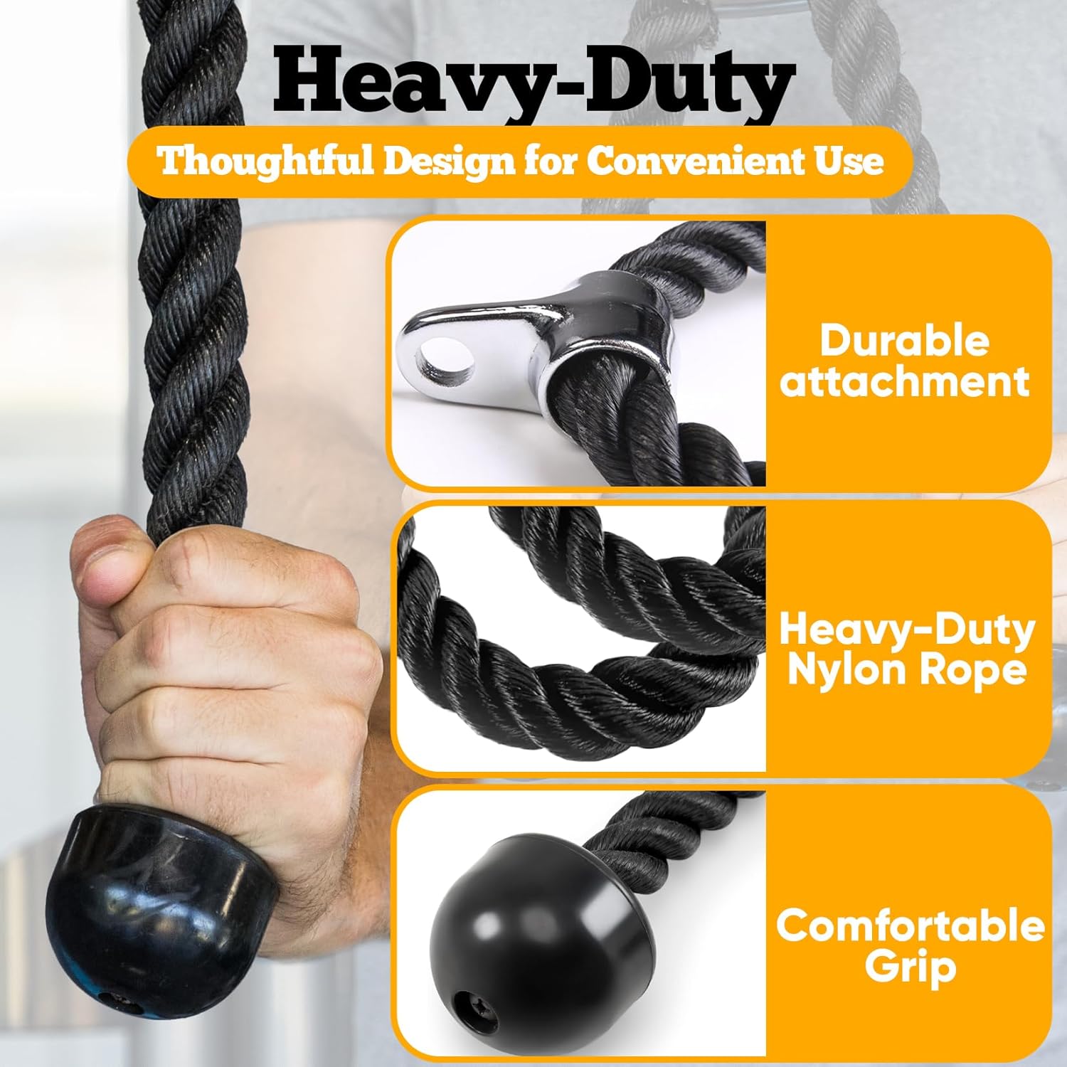1. Extra-Length Design for Versatile Workouts At 55 inches (4 feet 7 inches), this tricep pull-down rope is longer than standard ropes, allowing for a wider range of motion. Perfect for tricep pull-downs, shoulder exercises, and back stretches, it’s ideal for diverse workout routines.