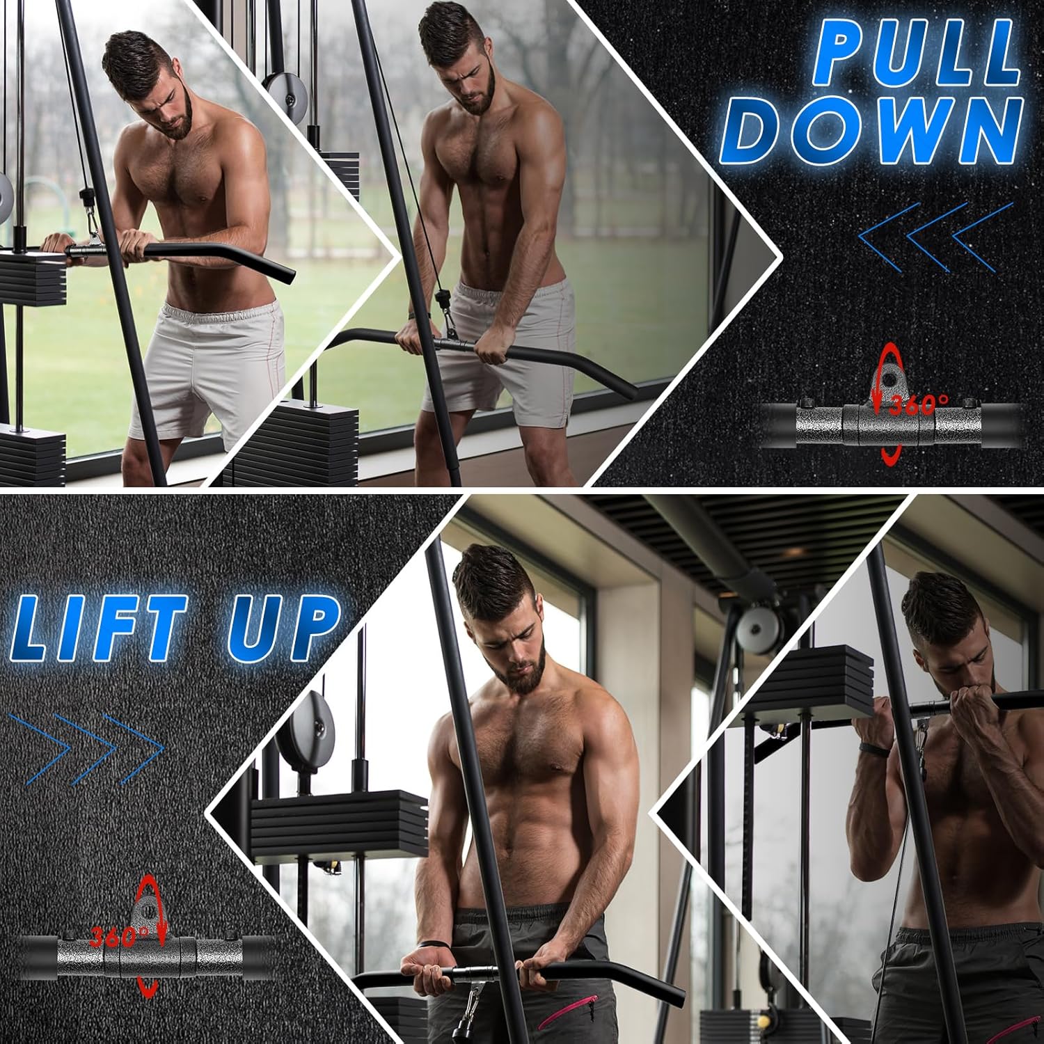 LAT pull down bar can be used for dozens of exercises, utilizing constant tension to build muscle effectively. Developing lagging muscles or strengthening those hard-to-train areas like the rear delta and upper back.