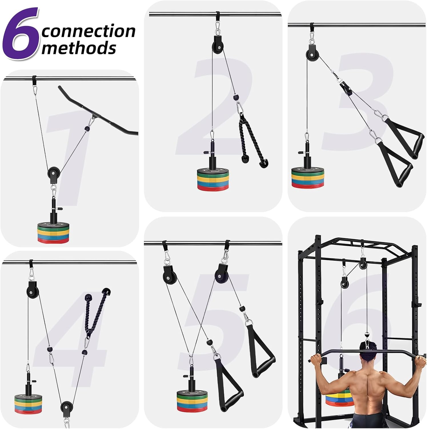 【Easy Assembly and Versatile Usage】Theweight pulley system for home gym is easy to set up and can be connected to squat racks, power racks, pull-up bars, beams, and more. It offers unparalleled versatility for home gym, garage, training studio, or physical therapy center use.