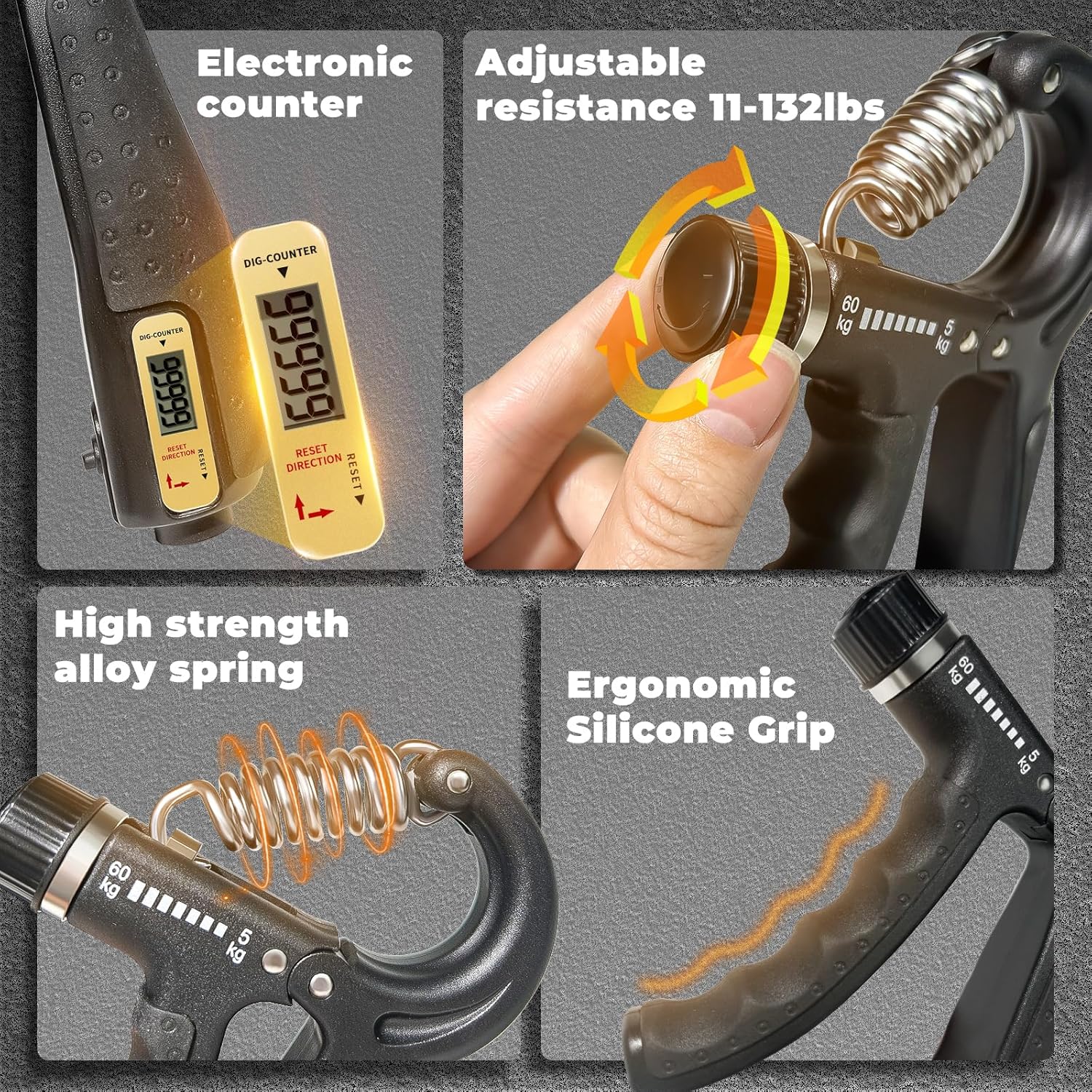 【Electronic counting adjustable resistance】Our grip strength trainer make it easier to develop a program to strengthen your grip or rehabilitate your hands. The electronic counting can count up to 99,999, no need to repeat the record of the number of groups you have completed. And the value can be reset to zero with one click. Adjustable resistance 11-132 Lbs hand grip strengthener can assist you in specifying a program of varying intensity.