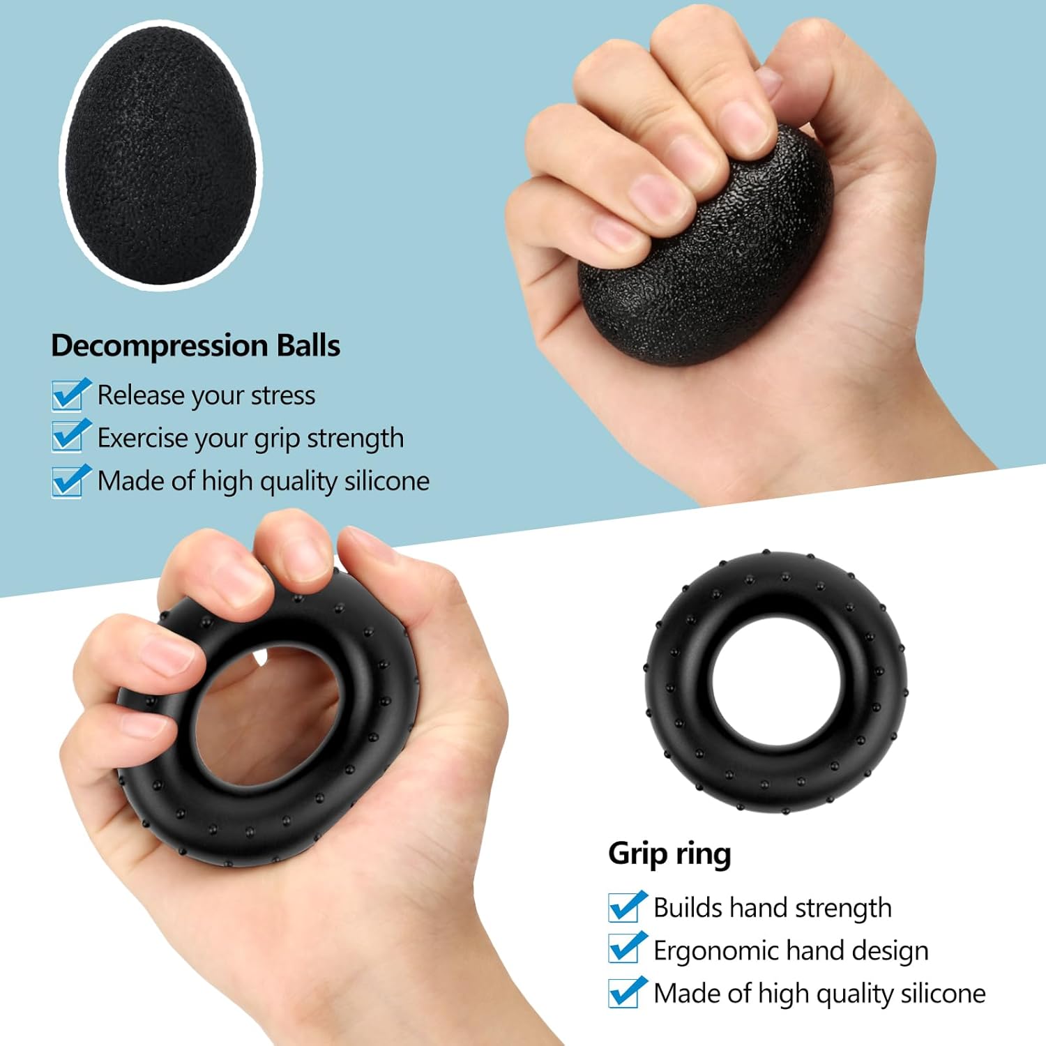 đȘ ăHigh Quality Silicone Materială: The hand strength trainer grips are made of high-density silicone material, well-made, with excellent wear resistance, softness and elasticity, which can extend the service life.