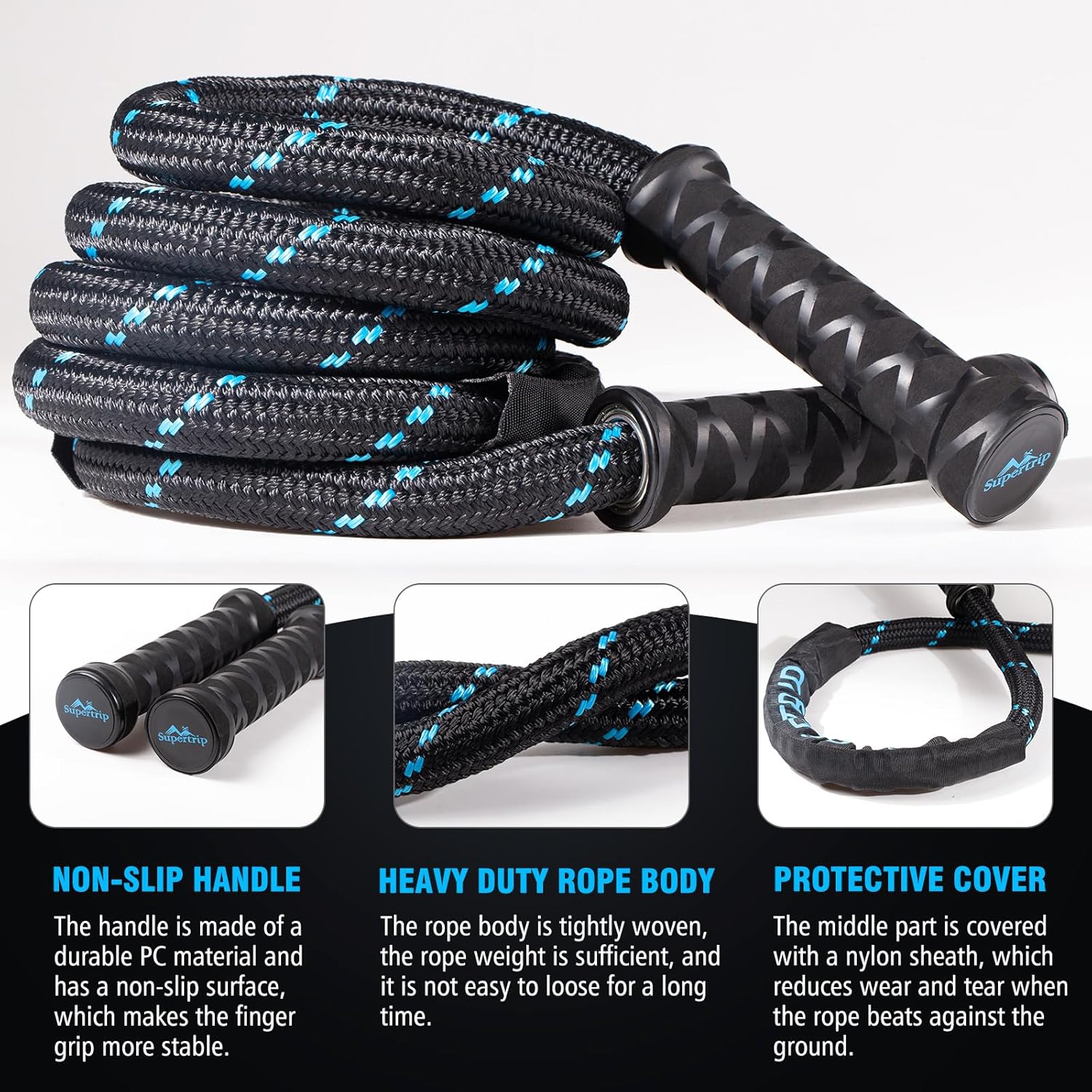 Supertrip’s heavy-duty jump rope has been upgraded to a 360-degree rotating handle with two high-quality stainless steel 6805ZZ high-speed bearings for each handle, which is made of a durable PC material with a non-slip surface for a more stable finger grip.