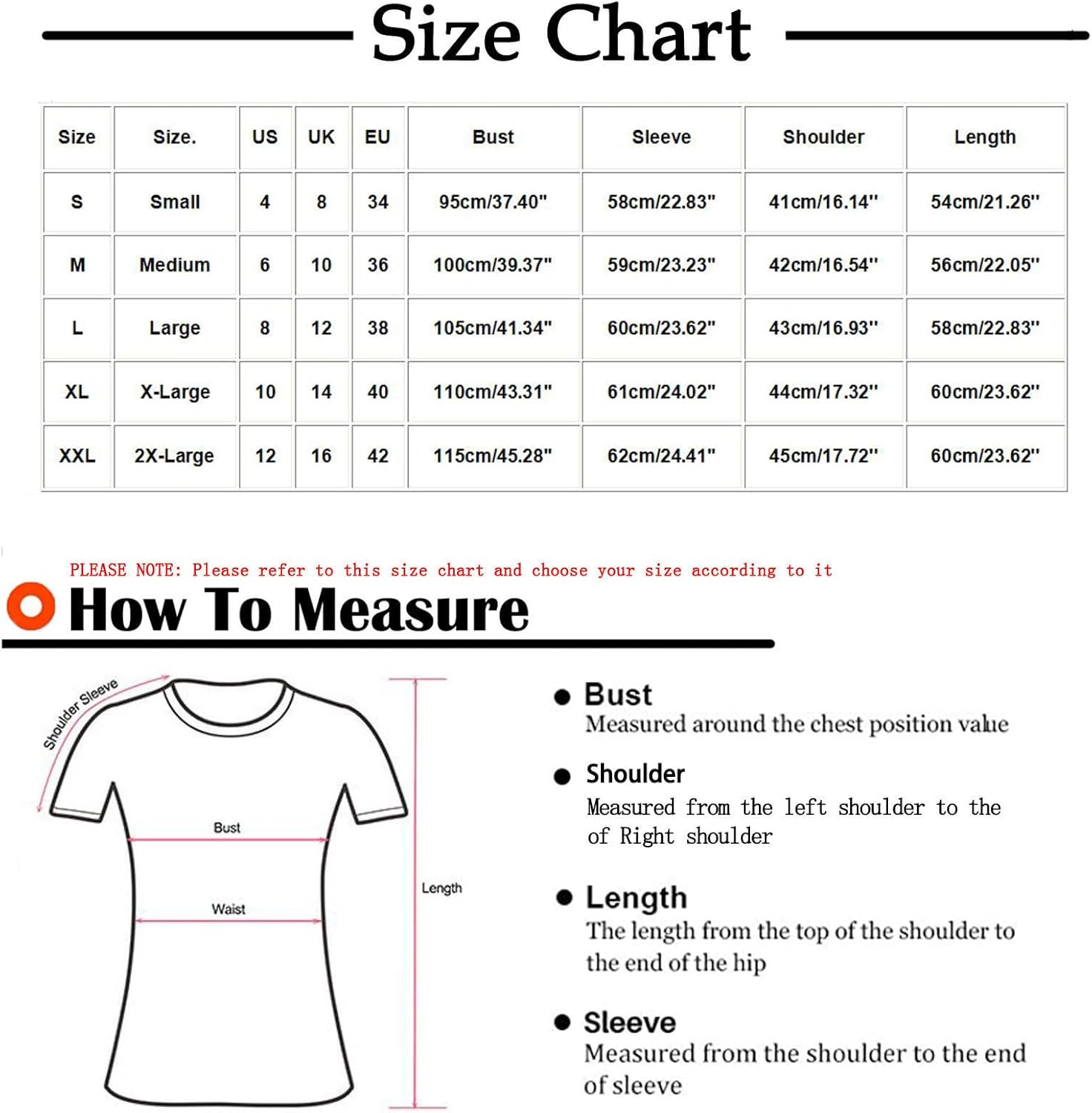 Size.: 2X-Large US: 12 UK: 16 EU: 42 Bust: 115cm/45.28” Sleeve: 62cm/24.41” Shoulder: 45cm/17.72” Length: 60cm/23.62”