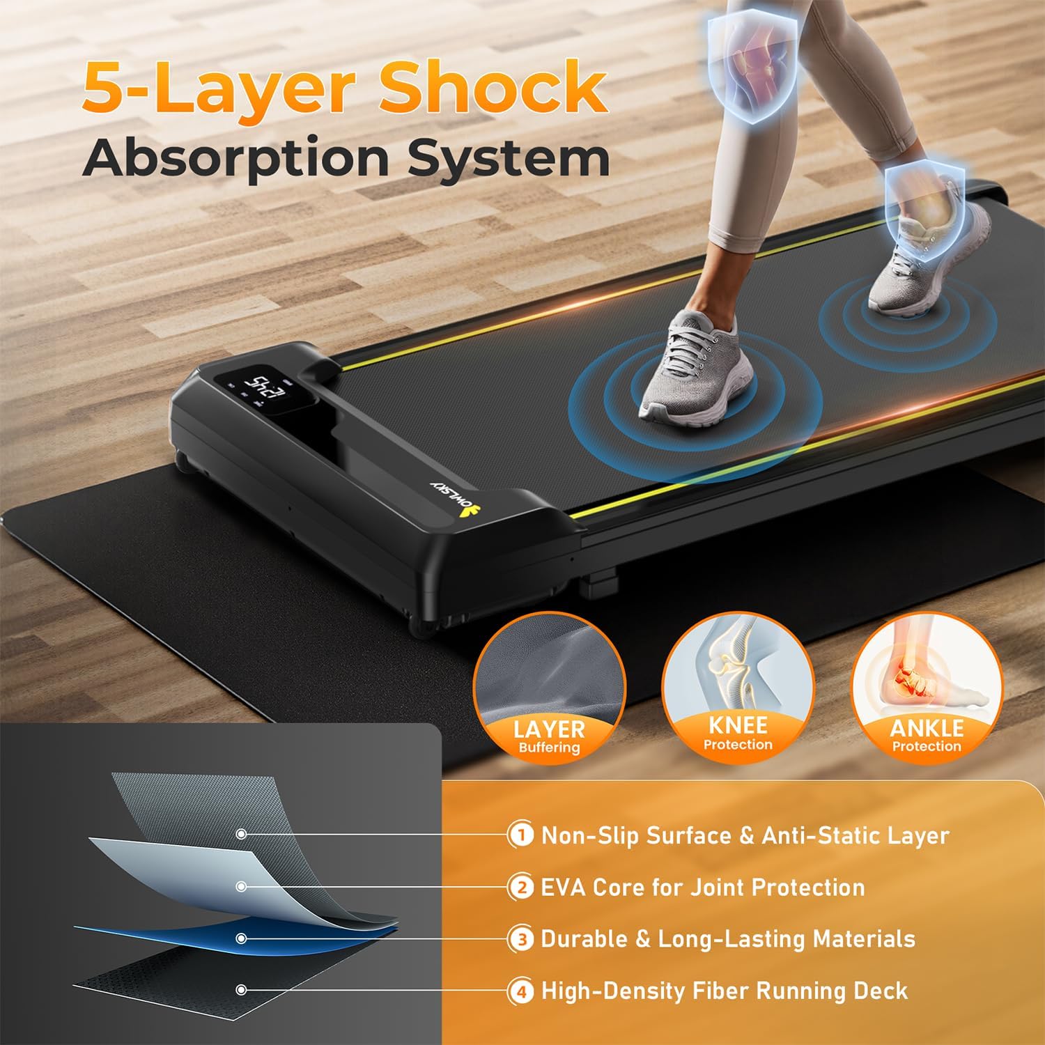 Enhance your home or office workout with the OWLSKY Running Treadmill, a compact and portable treadmill designed for small spaces and under-desk use. Its sleek black design and LED display make it a stylish addition to any room.