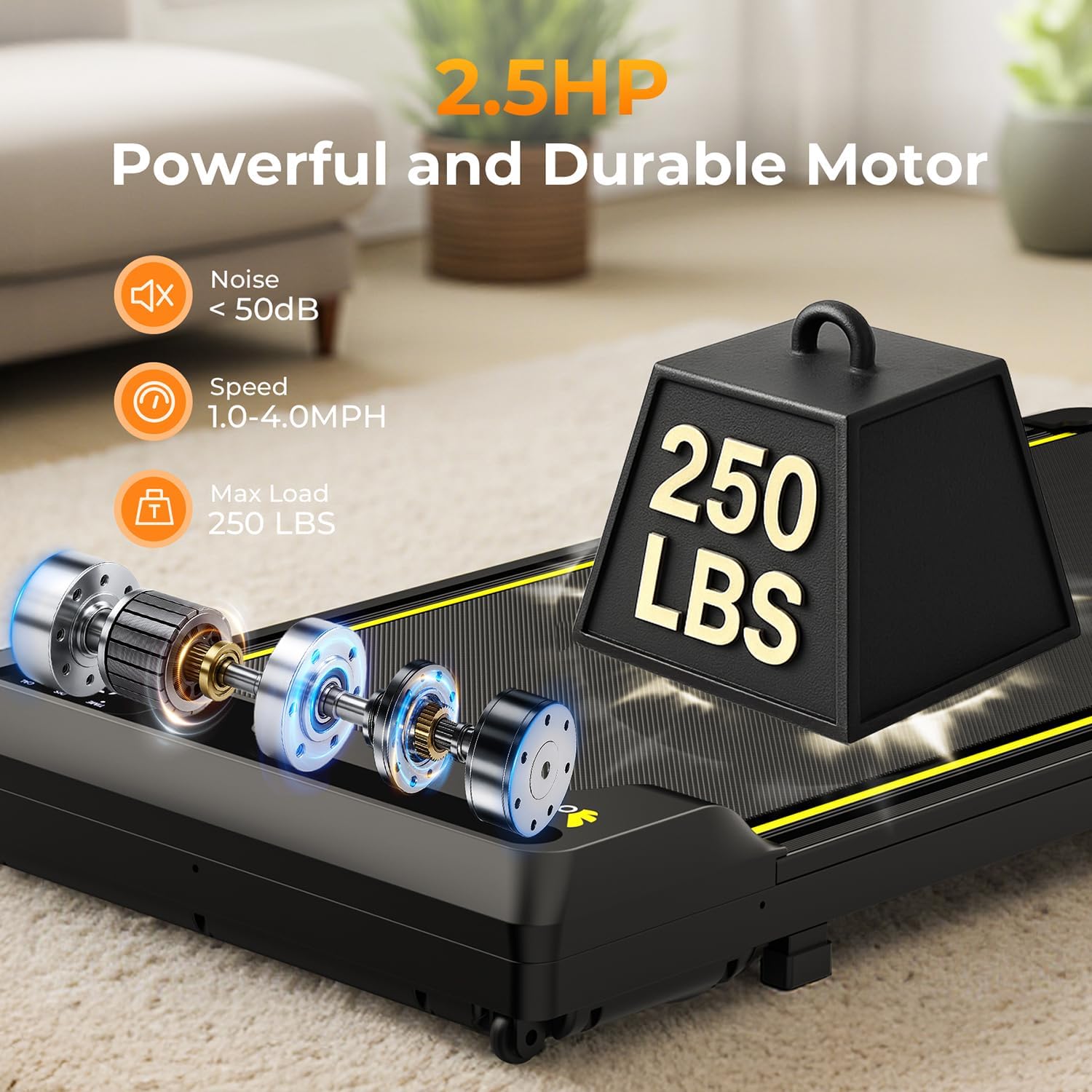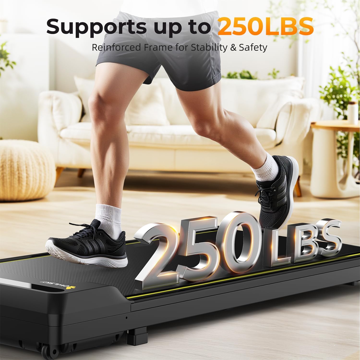 Designed for efficiency, this walking pad desk treadmill supports up to 250lbs and features a mini treadmill under desk design, making it ideal for use while working or relaxing at home.