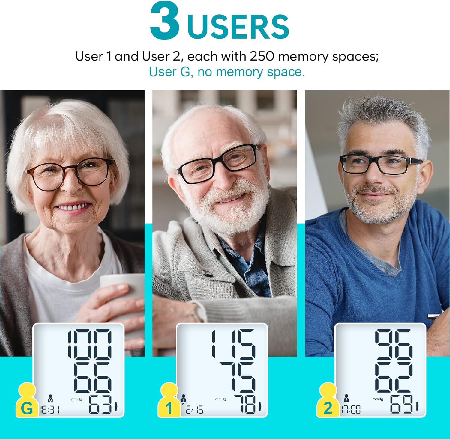 3 Users & 500 Memory on the Monitor, Unlimited with APP: This platinum-grade digital blood pressure meter supports up to three independent users and can store up to 500 records (250 records for each of the two users; User Guest has no memory space). Plus, with the MyHeartPal APP, there is unlimited storage of data. Every reading is timestamped, and the intelligent device automatically calculates the average of your last three readings, providing you with comprehensive and precise health data