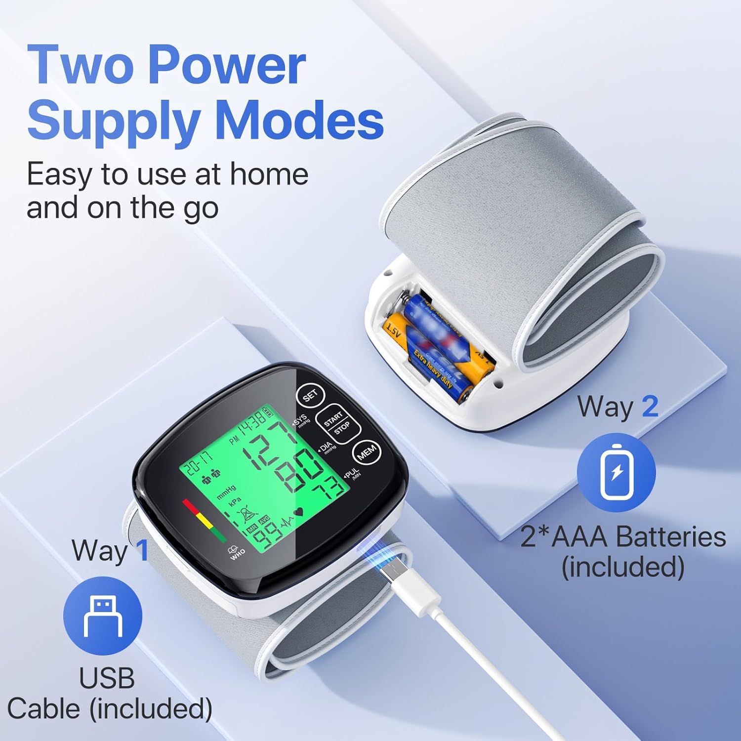 【Versatile Power Supply】Unlike other wrist blood pressure monitors, our device offers dual power supply options for ultimate flexibility. Whether you prefer to power it on using the USB cable that is included, or by using 2 AAA batteries (also included), our device is ready to adapt to your needs.