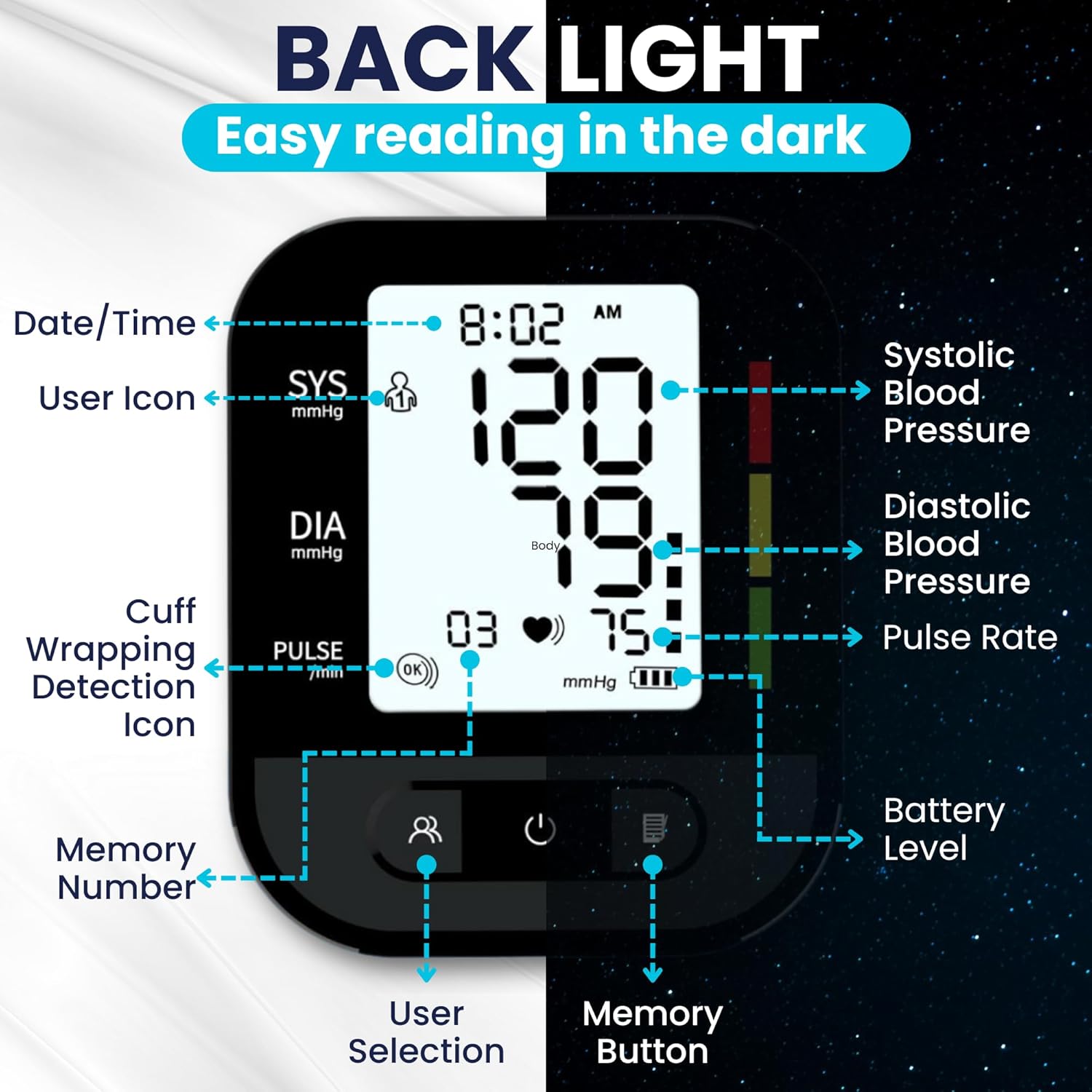 EASY-TO-READ DISPLAY: Equipped with a backlight screen, our blood pressure machine for home use allows you to clearly read your measurements in any light condition, making it perfect for day-to-night monitoring. The blood pressure classification indicator helps users understand their health status at a glance.