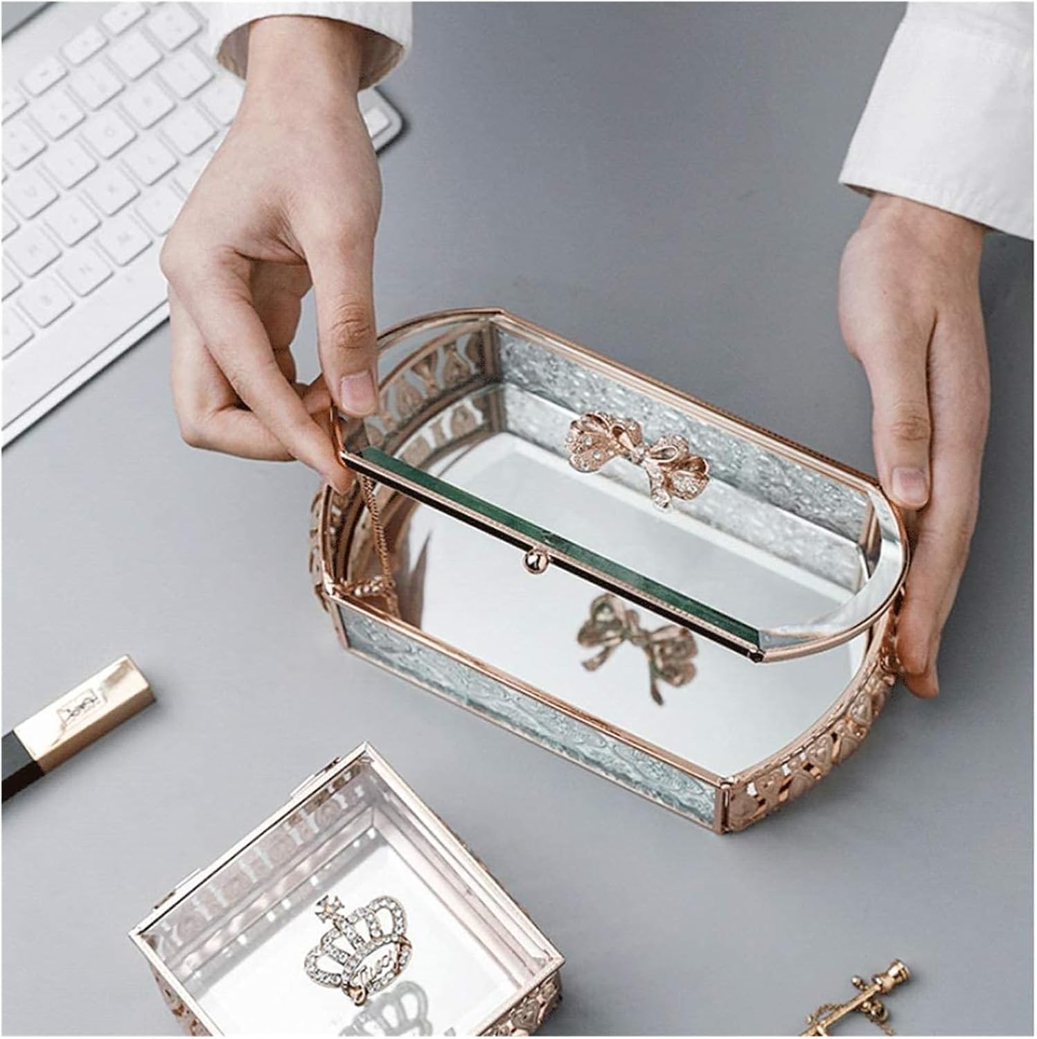 This set of European retro-style glass jewelry box adopts gilding and old craftsmanship, which shows a more classic charm.