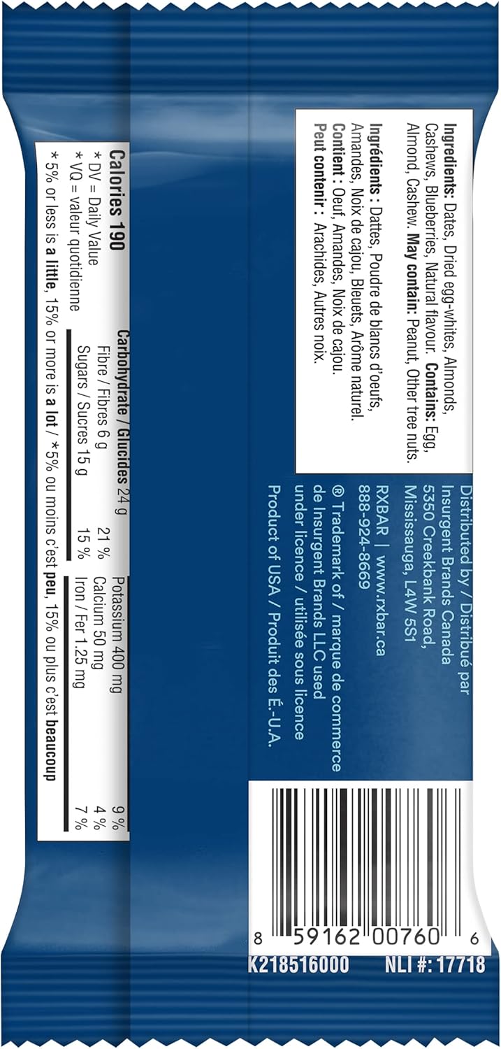 Sweet blueberries bursting with every bite. This protein bar has only 6 whole food ingredients and boasts 12 grams protein, 4 grams of fiber, no gluten, and has zero added sugar*. RXBARs are perfect as a convenient breakfast, on-the-go snack or as pre-or-post workout fuel. *Not a low calorie food.
