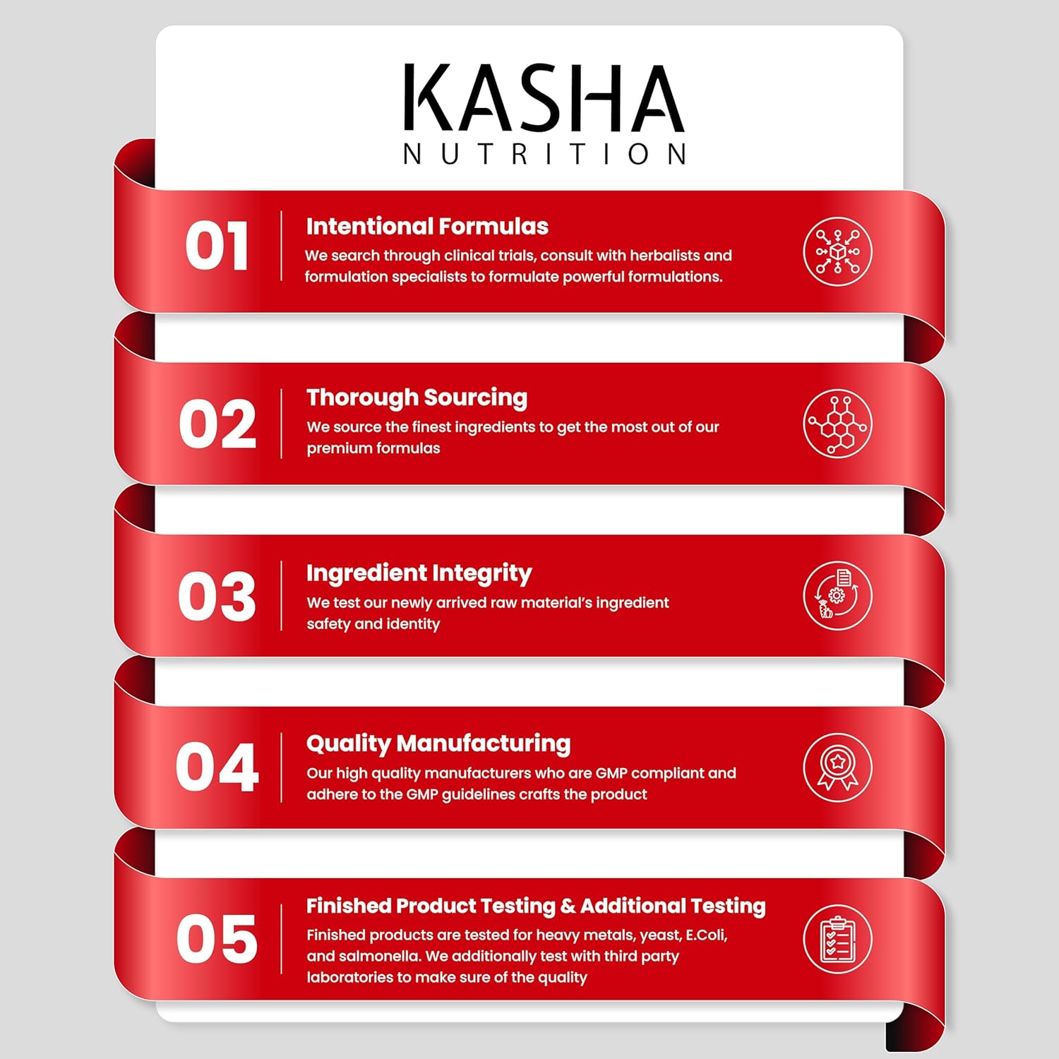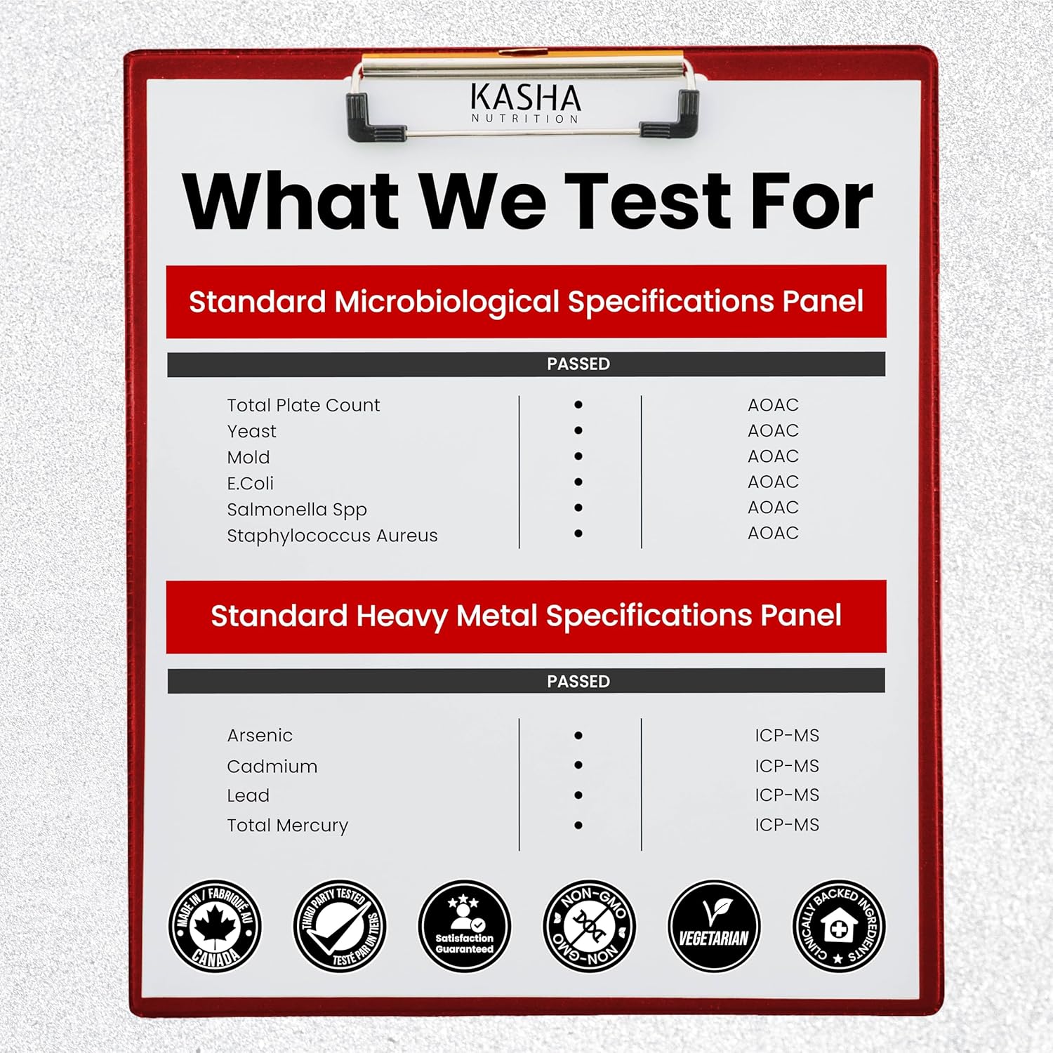 Kasha’s Quality: Made in Canada and 3rd party tested. We make sure the facility is GMP certified and a Canadian Facility, so that all our products are made locally in Canada. We make sure our product is safe through 3rd party testing. Check out our NPN: 80088086.