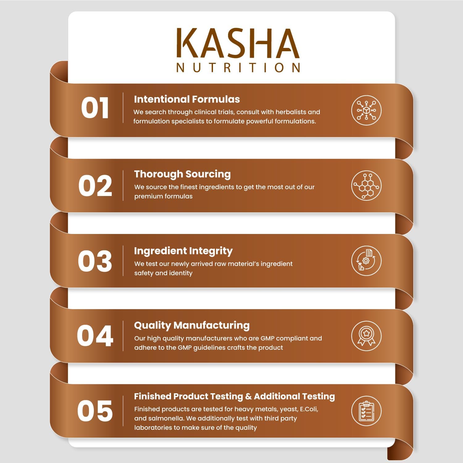 Kasha’s Quality: Made in Canada and 3rd party tested. We make sure the facility is GMP certified and a Canadian Facility, so that all our products are made locally in Canada. We make sure our product is safe through 3rd party testing. Check out our NPN: 80124919..