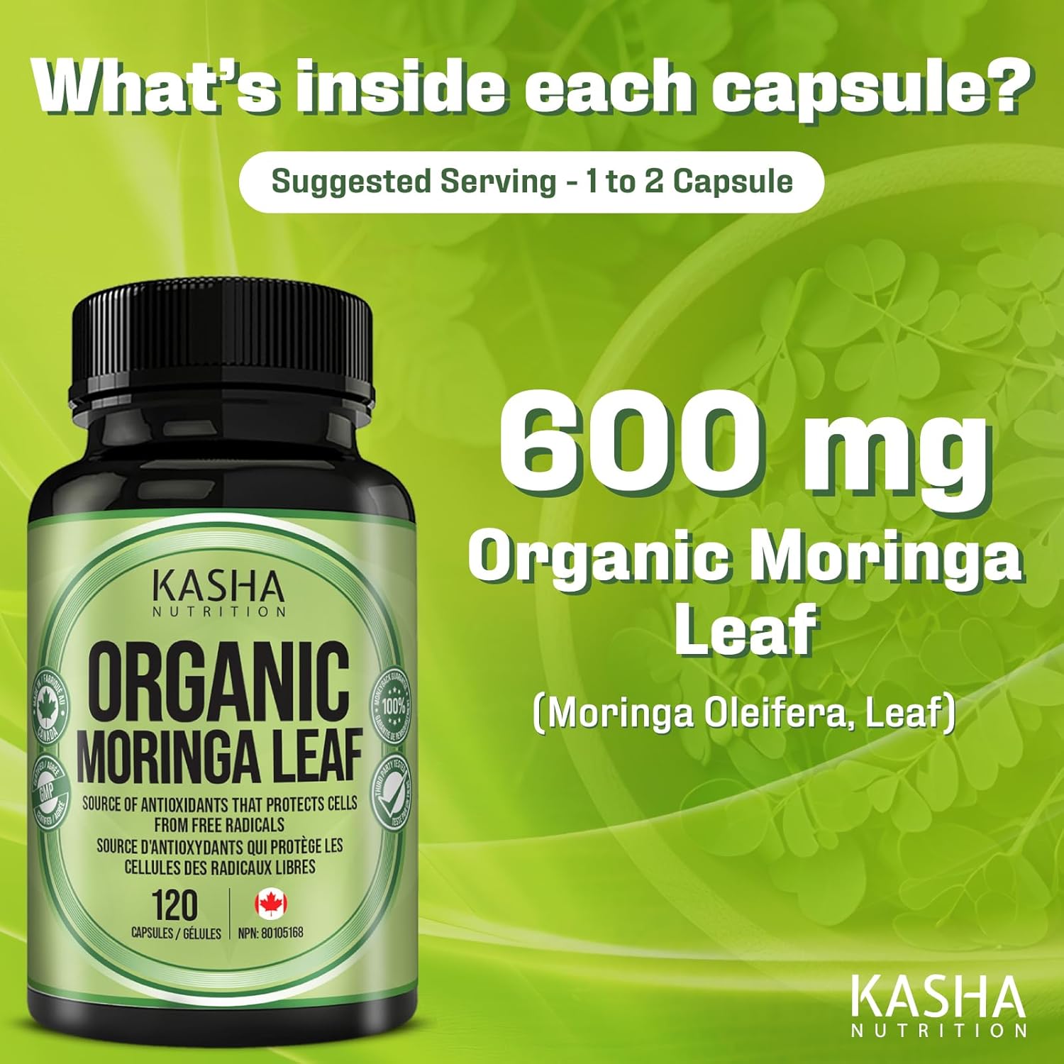 Kasha’s Quality: Proudly made in Canada in a GMP-certified facility. Every batch is third-party tested to ensure safety, quality, and purity. We use organically certified Moringa Oleifera leaves and are proud to share our NPN: 80105168.