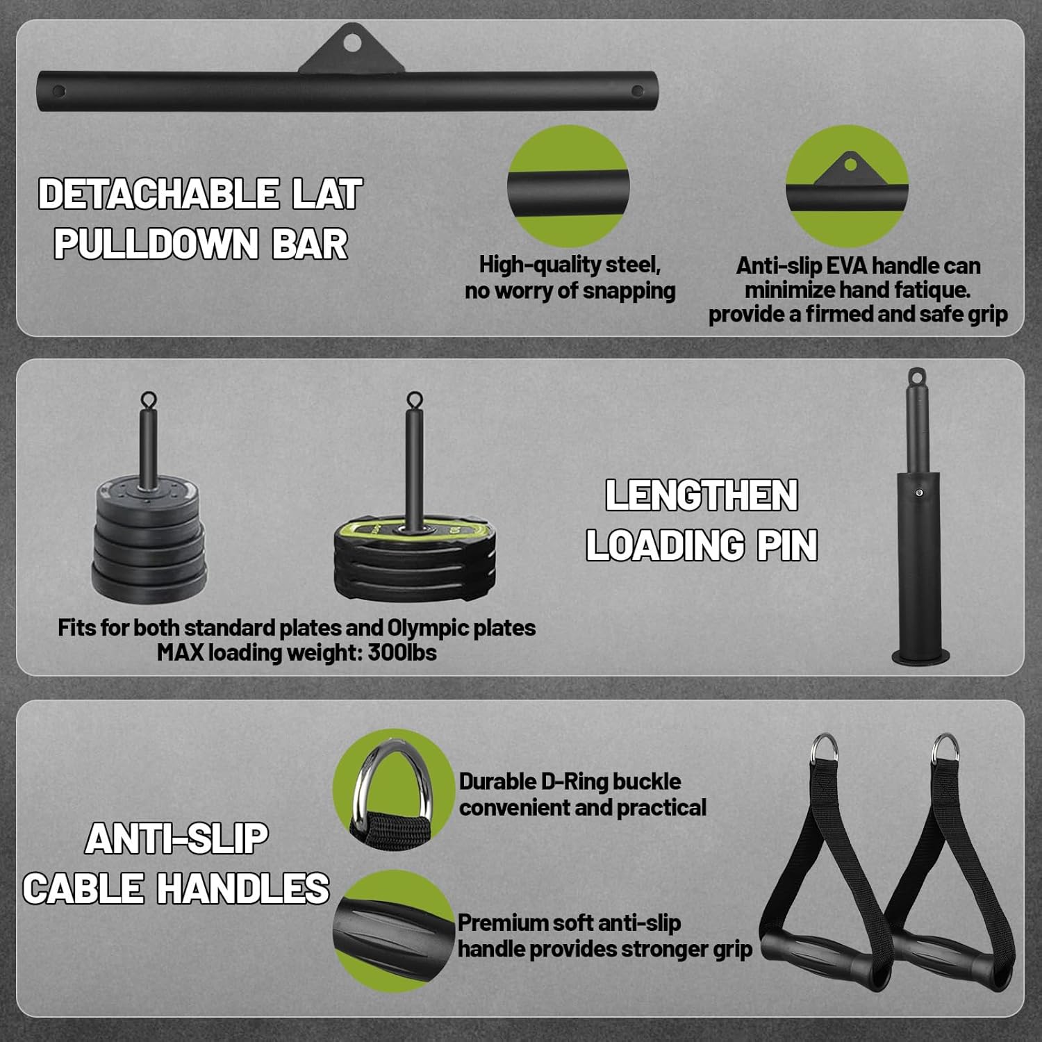 [Enhanced Pulley System, Versatile Exercise Options] Featuring the latest design with 2 pulleys, 3 cables, and a range of gym accessories, this pulley system offers the freedom to perform a variety of functional exercises. Whether you’re targeting biceps curls, triceps pull-downs, lat pull-downs, shoulders, arms, legs, or more, this system provides endless workout possibilities.