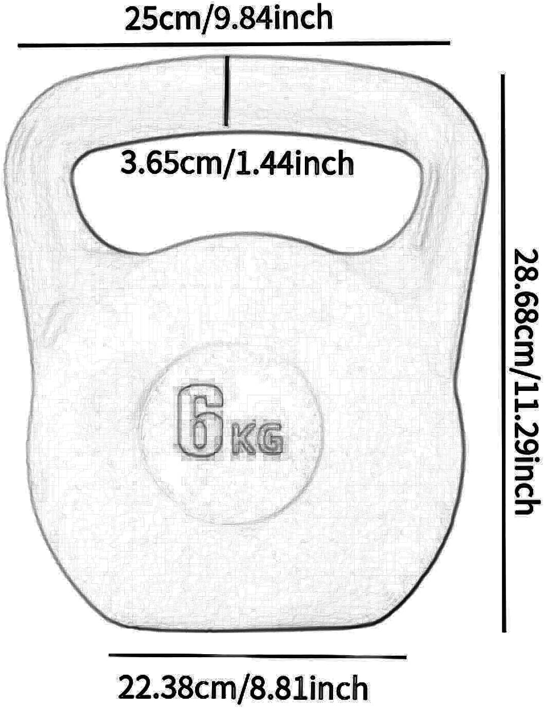 6kg: Base Diameter 22.38cm/8.81inch, Height 28.68cm/11.29inch, Handle 25cm/9.84inch, Handle Diameter 3.65cm/1.44inch;