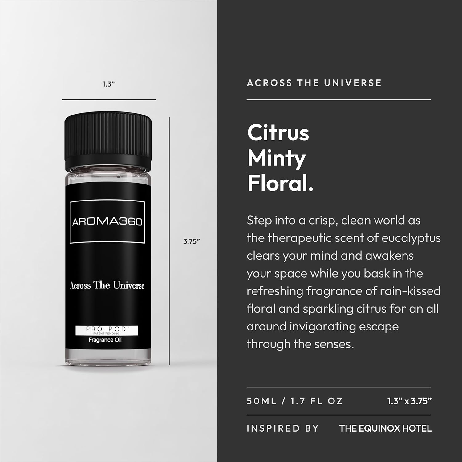 Inspired by: The Equinox Hotel Step into a crisp, clean world as the therapeutic scent of eucalyptus clears your mind and awakens your space while you bask in the refreshing fragrance of rain-kissed floral and sparkling citrus for an all-around invigorating escape through the senses ignited by the fragrance, Across the Universe Pro-Pod (patent pending). Top Note – Eucalyptus, Lemon, Cornmint, Citron Middle Note – Rose Oxide, Cyclamen, Lilac, Lavender Base Note – Nutmeg, Sandalwood, Musk