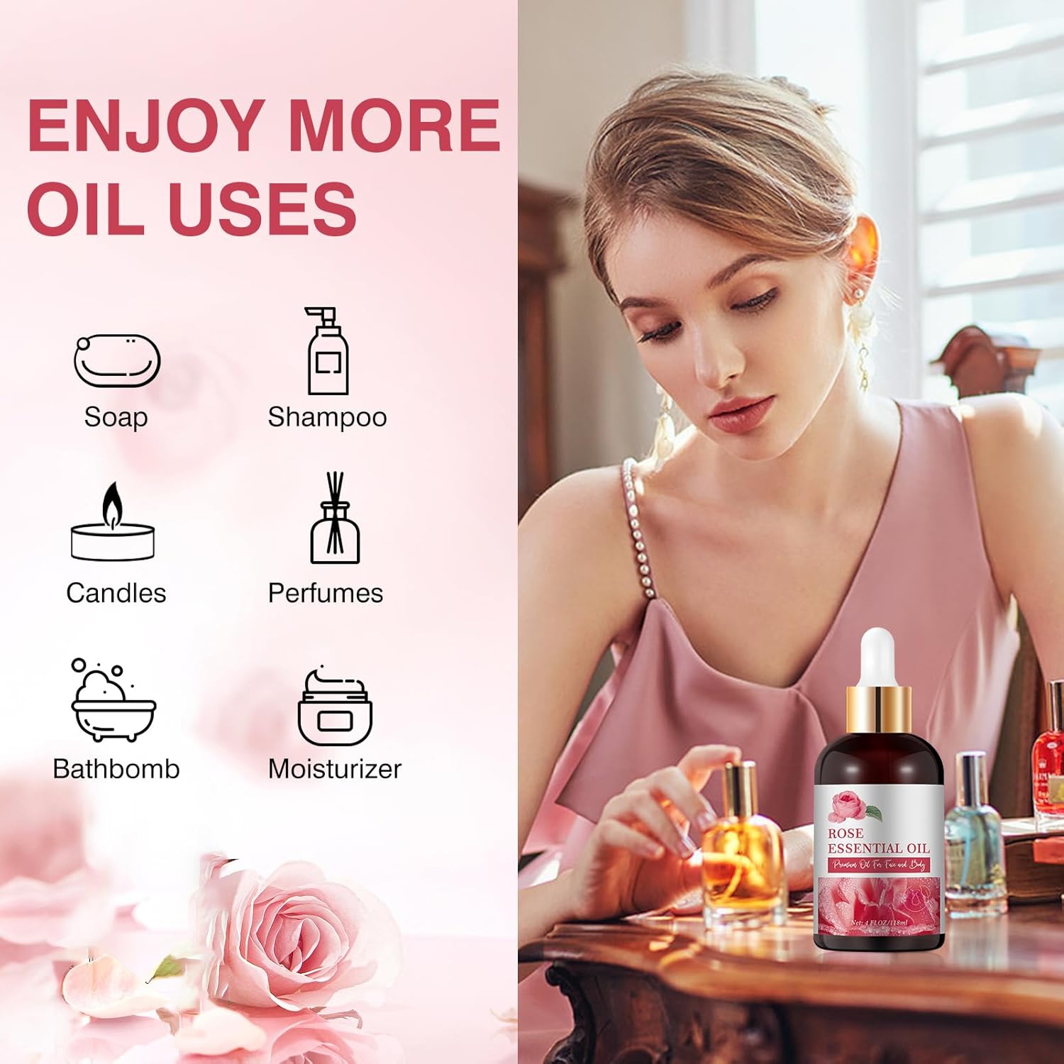 ESSENTIAL OIL FOR SKINCARE: Rose essential oil is great for massage and skin oil, hydrates deeply, and locks that moisture all day.