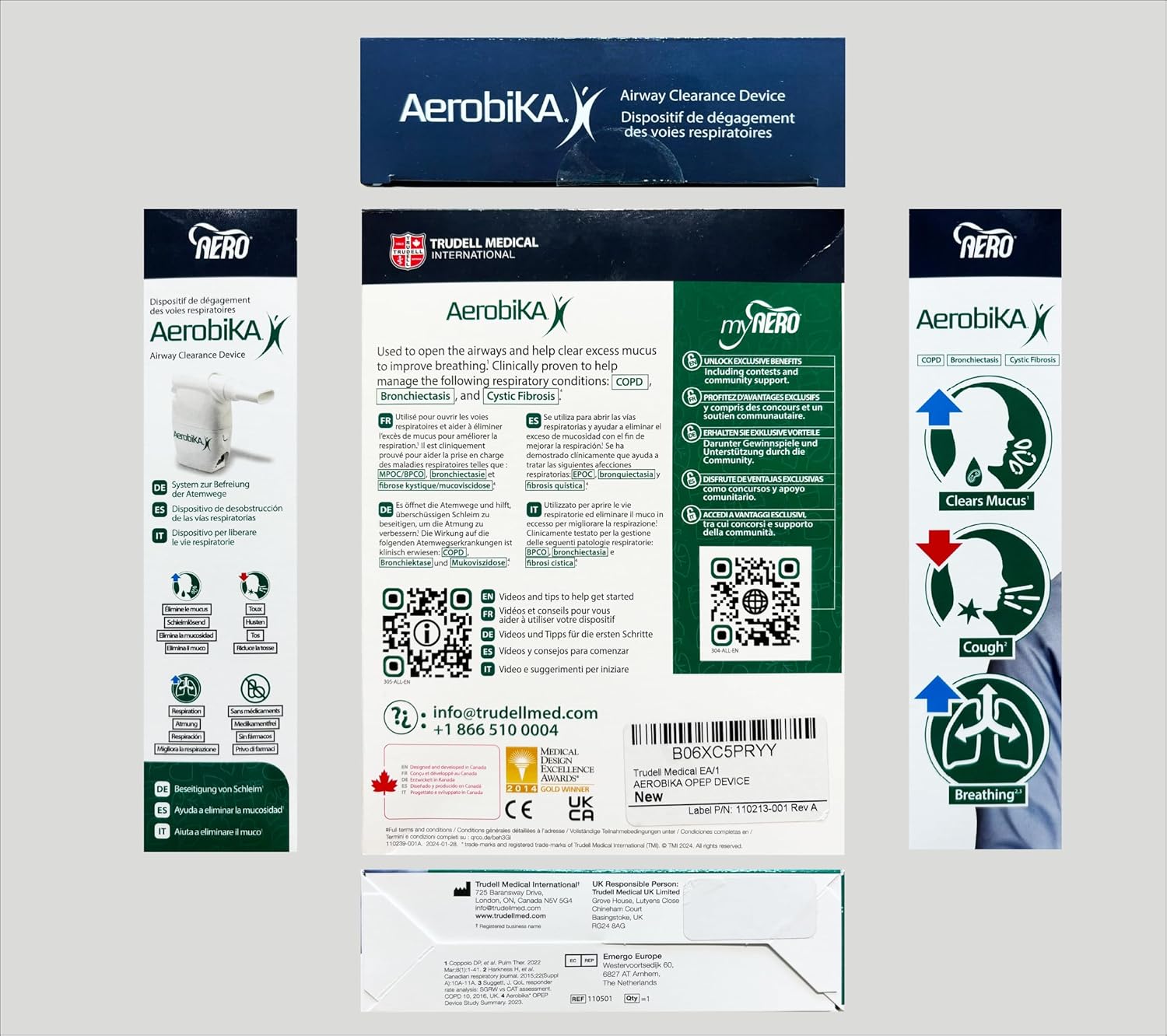 QUICK AND EASY TO USE – One size fits all design can be used for as little as 10 minutes, twice per day. Five selectable resistance settings to fit your physio needs and comforts. Unlike devices with a steel ball, the Aerobika* device can be used in any orientation