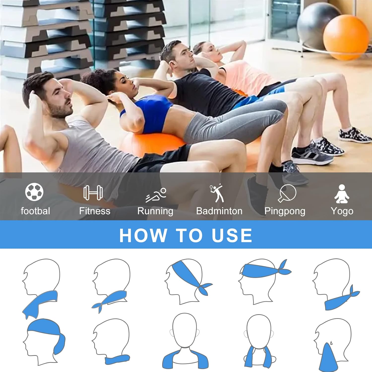 SPECIFICATIONS: The 5pcs pack of cooling towels comes in vibrant colours such as: green, blue, gray, purple, and orange. Their large size, 30 x 100 cm, makes them perfect to wear as a headband, bandana or a neck towel.